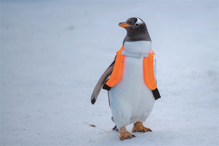 12月13日,哈尔滨极地公园的企鹅在户外进行巡游。