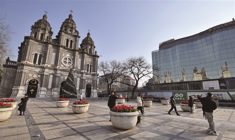 游人游览王府井的历史文化建筑(12月11日摄)。