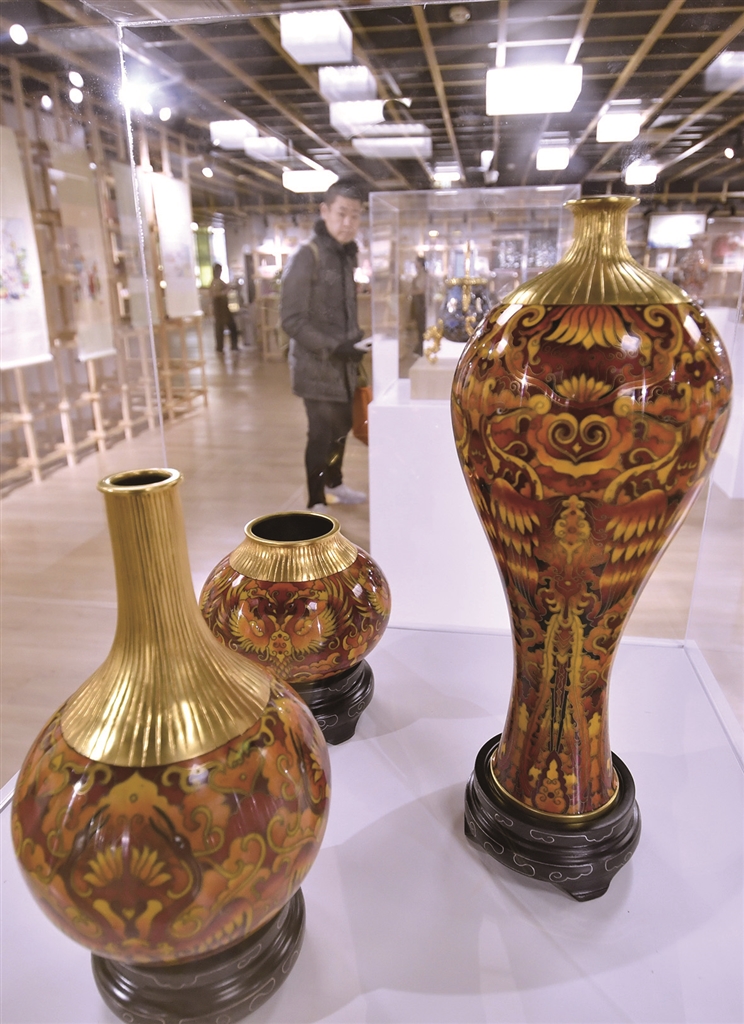 顾客在王府井步行街的工艺美术大厦观赏展出的非物质文化遗产精品(12月11日摄)。