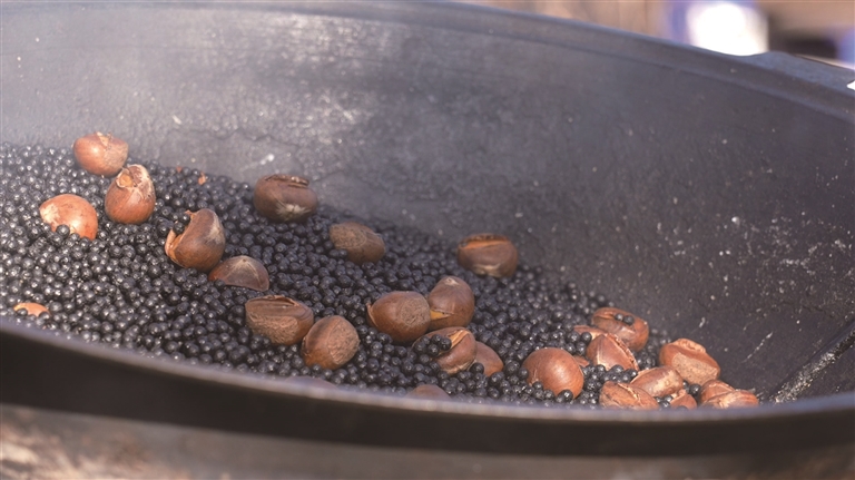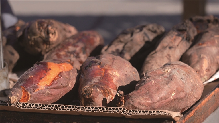 不远处,烤红薯的炉子正冒着热气。烘烤至熟的红薯外皮微焦,轻轻掰开,金黄的薯瓤软糯绵密,一股浓郁的香甜随风飘散,是许多人记忆中冬天最朴素也最满足的味道。而另一侧,糖炒栗子摊前也围拢着不少顾客。铁锅持续翻动,栗子在黑砂中“沙沙”作响,逐渐绽开油亮的口子,散发出阵阵焦香。摊主张玉东一边忙碌一边说道:“如今天气转凉,吃栗子的人越来越多。尤其是下午到晚上,大家逛街、下班路过,都喜欢买上一包既暖手又解馋。”