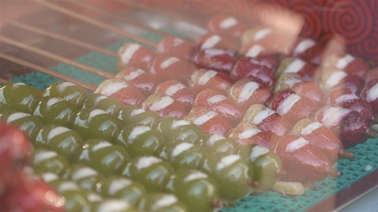 走在奇台的街巷间,各色摊点俨然成为冬日里一道亮丽的风景。糖葫芦摊前最为热闹,晶莹剔透的糖衣包裹着各式鲜果,在阳光下泛着诱人的光泽。除了传统的山楂,还有葡萄、草莓、橘子等口味,一串串糖葫芦亮晶晶地插在草架上,色彩缤纷,吸引着来往行人的目光。