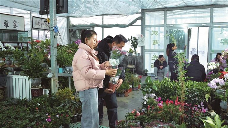 进入冬季,室内温暖干燥,许多居民喜欢购买鲜花和绿植装点家居,既能增添生机,还可调节空气湿度。在兰州湾镇凤城花市,蝴蝶兰、百合等花卉争奇斗艳,绿萝、富贵竹、发财树等绿植充满生机,顾客往来其间,仔细挑选心仪的盆栽。