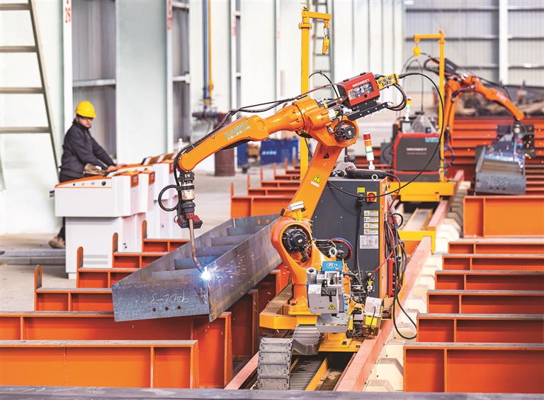 12月14日,在位于昌吉国家高新技术产业开发区鸿星东南建筑科技(新疆)有限公司的厂房里,工人在操作机器生产钢结构订单产品。该公司有8条智能化生产线,专注于箱型柱、大跨度空间钢结构、绿色建材等产品的研发制造,年产能超10万吨。□本报记者 何 龙摄