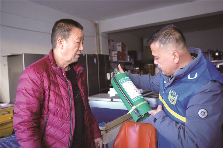为进一步压实商户安全生产主体责任,消除火灾安全隐患,12月20日,吉木萨尔县三台镇消防安全宣传志愿小分队走进集市,开展消防安全整治行动。图为宣传员检查商铺消防设施器材是否完好有效。□吴欣昊摄