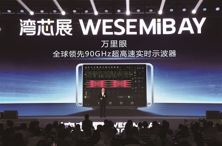 近日,在深圳举行的2025湾区半导体产业生态博览会(湾芯展)上,我国自主研发的新一代超高速实时示波器正式发布,其带宽突破90GHz、达到国际先进水平,标志着全球电子通信产业迎来超高速信号“中国标尺”(2025年10月15日摄)。□新华社记者 毛思倩摄