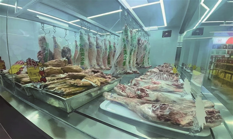 12月16日,首家木垒羊肉官方旗舰店开业,店内羊肉产品整齐陈列。□石 倩摄