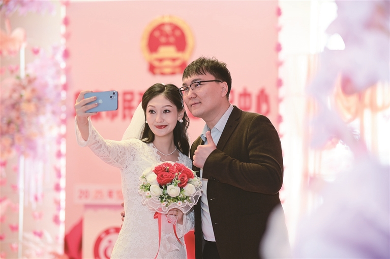 在现场,浪漫温馨一幕幕不断上演。无论是等待登记,还是已经登记的新人,都是成双成对,牵手而行。魏雯在完成登记后,还主动化身“编外摄影师”,为其他领证的新人拍照留念,“能帮大家记录下这么幸福的时刻,我特别高兴。”