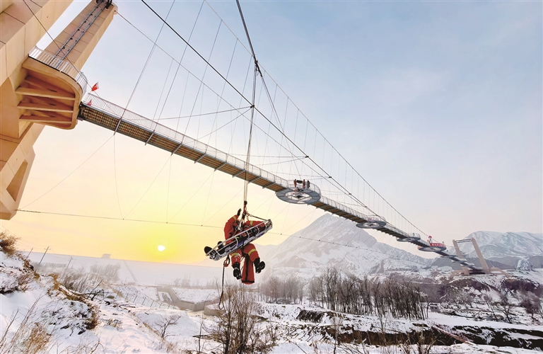 近日,昌吉州消防救援支队在呼图壁县雀尔沟镇狼塔C线起点附近开展严寒天气下山岳救援实地、实装、实操演训。图为演训模拟一名游客在桥梁游玩时不慎坠落,消防救援人员对其展开营救的场景。 □洪文乐摄