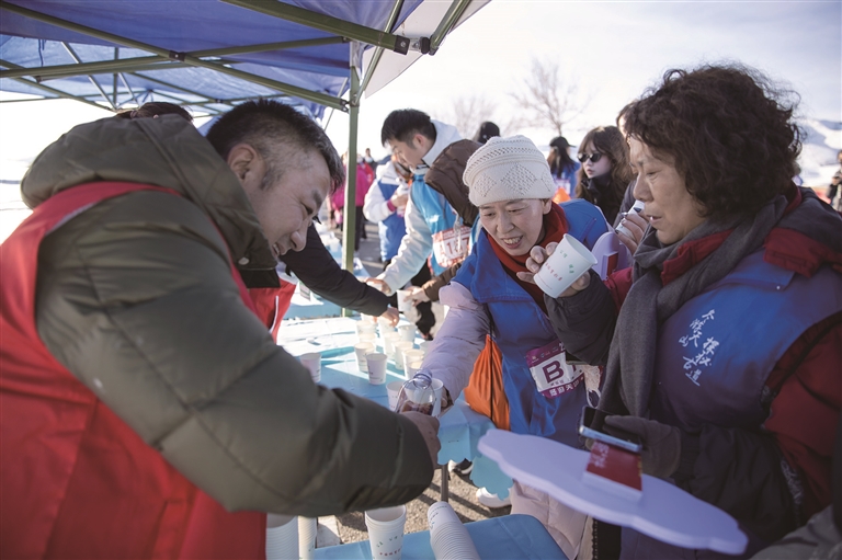 12月28日,奇台县江布拉克景区,徒步爱好者在补给点接受能量补给。