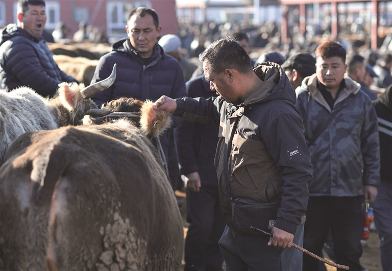 在新疆伊宁县的新疆创锦黄公农产品交易市场,牛羊成群围在栏中,牧民与牲畜经纪人大声商谈、击掌握手、买卖牲畜。这里又称“皇宫巴扎”,历史悠久,是新疆规模较大的活畜交易市场。目前,有超过3000名牲畜经纪人活跃于此,他们是连接牧场与市场的“纽带”——农牧民盼着以优价售卖牛羊等牲畜,但又难以直接接触到买家,不能准确把握市场行情;而各地的买家则希望高效、优惠地购入新疆高质量的牲畜。牲畜经纪人通过自己的经验和人脉,为农牧民与买家牵线搭桥,促成新疆优质畜牧产品销至全国,也助力繁荣乡村经济。