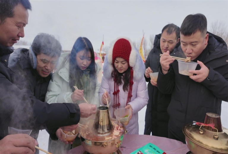除了农副产品展销,各类互动体验活动更让现场氛围持续升温。舞台上,《福到咱家》《中国美草原美》等舞蹈节目轮番上演,台下叫好声此起彼伏;“品民俗暖锅宴·尝乡味忆乡情”环节里,热气腾腾的火锅、饺子端上桌,大家围坐品尝,一口热食入腹,冬日的寒意一扫而空;打陀螺、射箭比赛、雪地摩托车体验区,大人小孩玩得不亦乐乎,雪地间处处回荡着欢声笑语;写福字、手工粉条制作等民俗体验项目前,游客们纷纷参与其中,亲手感受传统技艺的独特魅力。