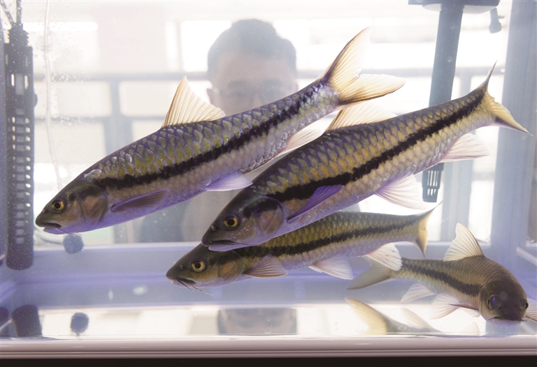 这是发布会现场展示的软鳍新光唇鱼“墨龙1号”(2025年12月22日摄)。