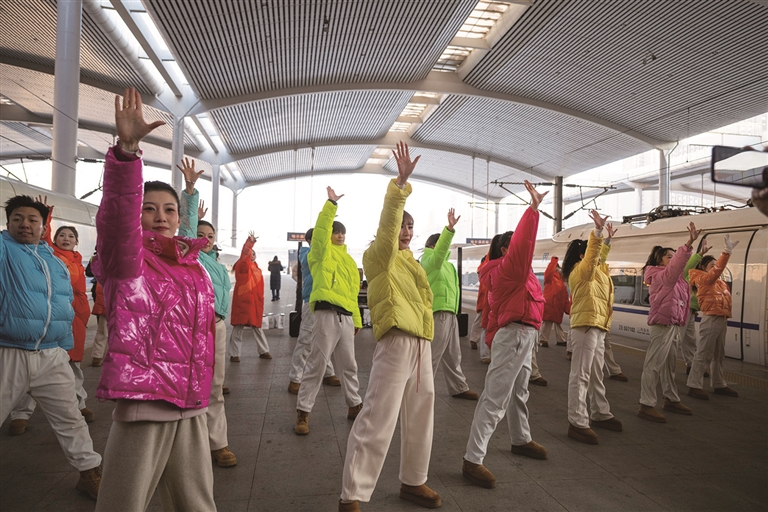 左图:1月4日,演职人员在“哈尔滨冰雪大世界”主题高铁列车G1276外表演。