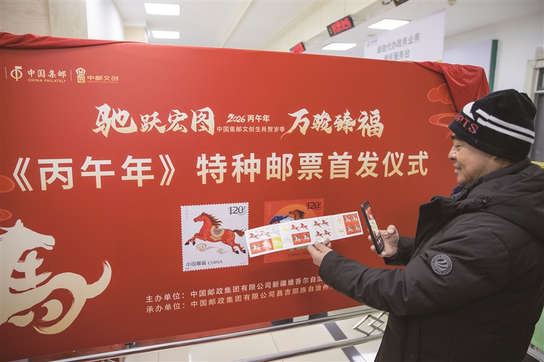 本报讯 记者巨海成报道:1月5日上午,中国邮政正式发行《丙午年》特种邮票,以“驰跃宏图”与“万骏臻福”两大主题惊艳亮相,迅速点燃昌吉集邮爱好者的热情。首发当天,中国邮政集团有限公司昌吉回族自治州分公司营业厅已排起长队,大批集邮爱好者冒着严寒前来,只为第一时间一睹马年生肖邮票的真容。