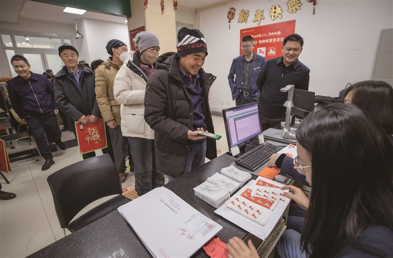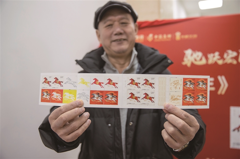 1月5日10时,等候购买马年生肖邮票的队伍渐长。“太激动了!我早晨九点半就过来排队了,就为了抢到首日封。”集邮爱好者王淑芬一边小心翼翼地将邮票放入集邮册,一边笑着说,“这‘驰跃宏图’画得真有劲儿,马蹄腾空、鬃毛飞扬,一看就是奔着好日子去的。”队伍中,有白发苍苍的老邮迷,也有年轻的“新藏家”,大家不时交流着集邮心得,畅谈对“马票”设计的期待。