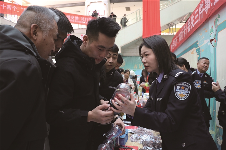 1月6日,呼图壁县开展“110宣传日”主题活动。图为活动现场,民警向群众宣传禁毒知识,识别毒品种类。□宋凯琪摄