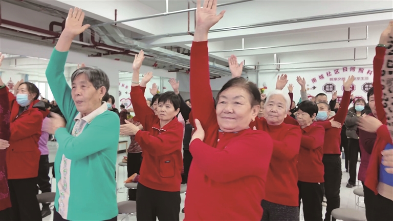 近日,在玛纳斯县玛纳斯镇南城社区,居民们在学习健康养生操。□朱文斌摄