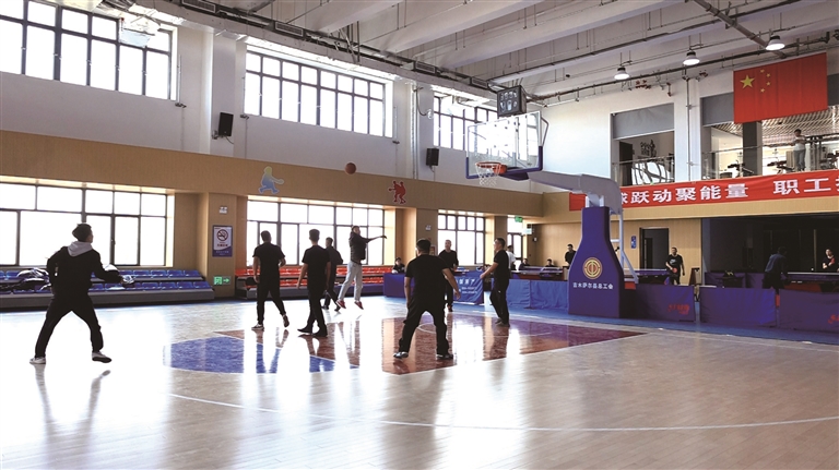 吉木萨尔县工人文化宫里,篮球爱好者们在室内篮球场切磋球技。