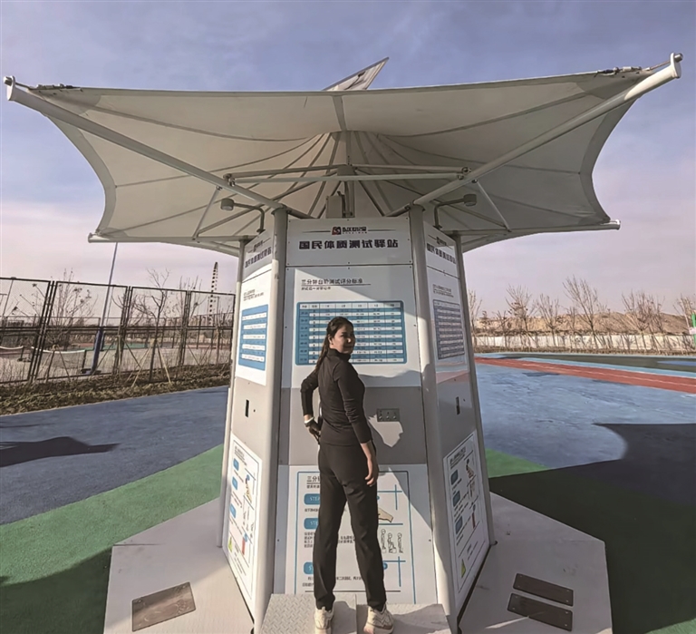 吉木萨尔县北庭体育公园里,跑步爱好者正在国民体质测试驿站进行检测。