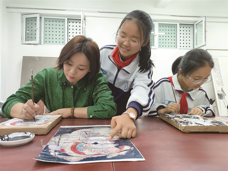 “泥板岩彩壁画”美术课,由该校美术教师高慧华2023年9月开设,她把以龟兹壁画为主,涵盖柏孜克里克千佛洞壁画、北庭西大寺壁画等具有代表性的新疆洞窟壁画技艺,变成学生们可触、可感、可传承的“活”的艺术。