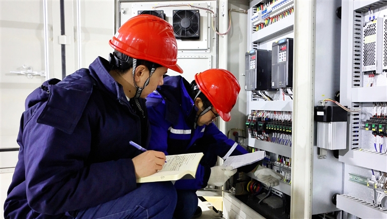 近日,在三峡集团新疆吉木萨尔全钒液流储能电站设备区,技术人员正在检查设备运行情况。□叶 钰摄