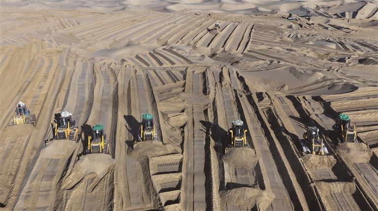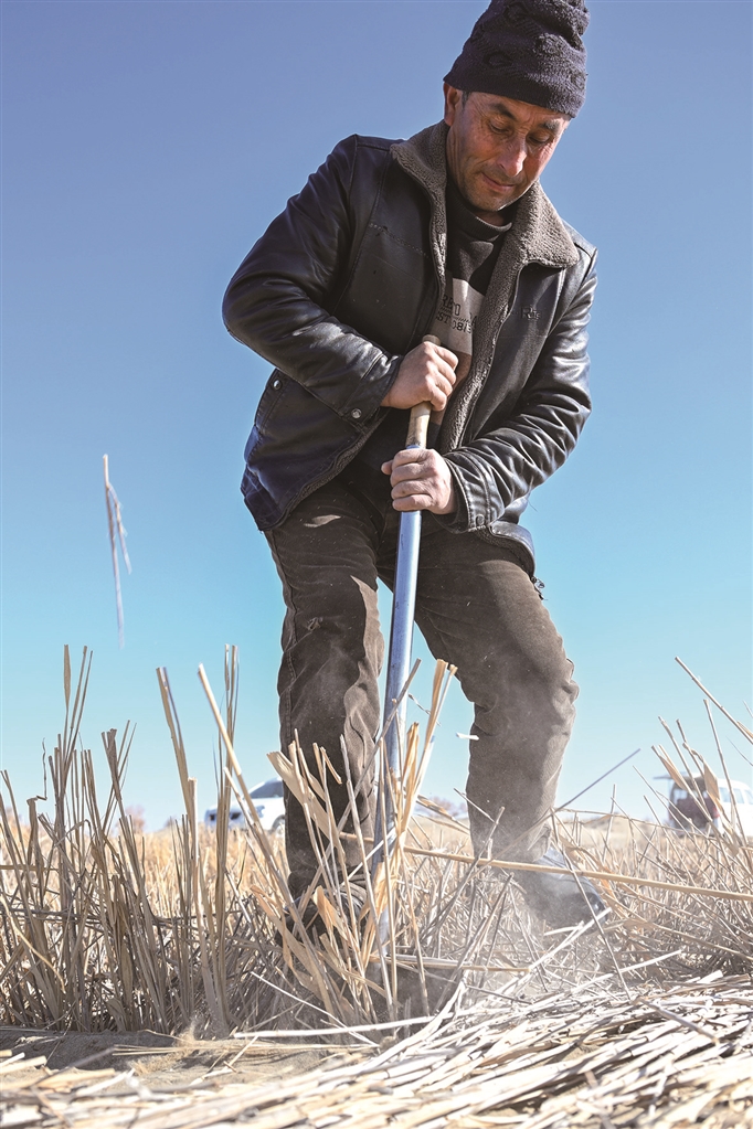 寒冬时节,尽管塔克拉玛干沙漠南缘的新疆和田地区墨玉县气温跌破零摄氏度,这里却涌动着治沙攻坚的热潮。数十台推土机轰鸣作业,推筑阻沙堤、平整沙丘,本地农户忙着收割加工芦苇、铺设草方格,冬季治沙工程高效推进。
