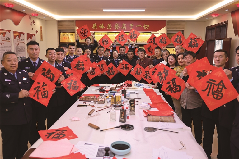近日,昌吉市公安局三工镇派出所,“万福迎春写春联送‘福’进警营”活动现场,民辅警展示福字。□本报记者 廖冬云摄
