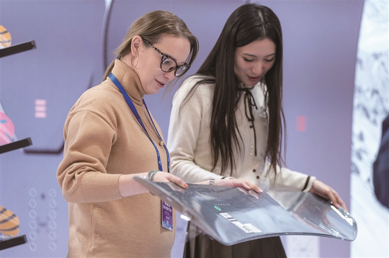 下图:1月6日,在2026哈尔滨国际冰雪经济博览会展会现场,参会嘉宾(左)为参观者介绍智能碳纤维滑雪板性能。