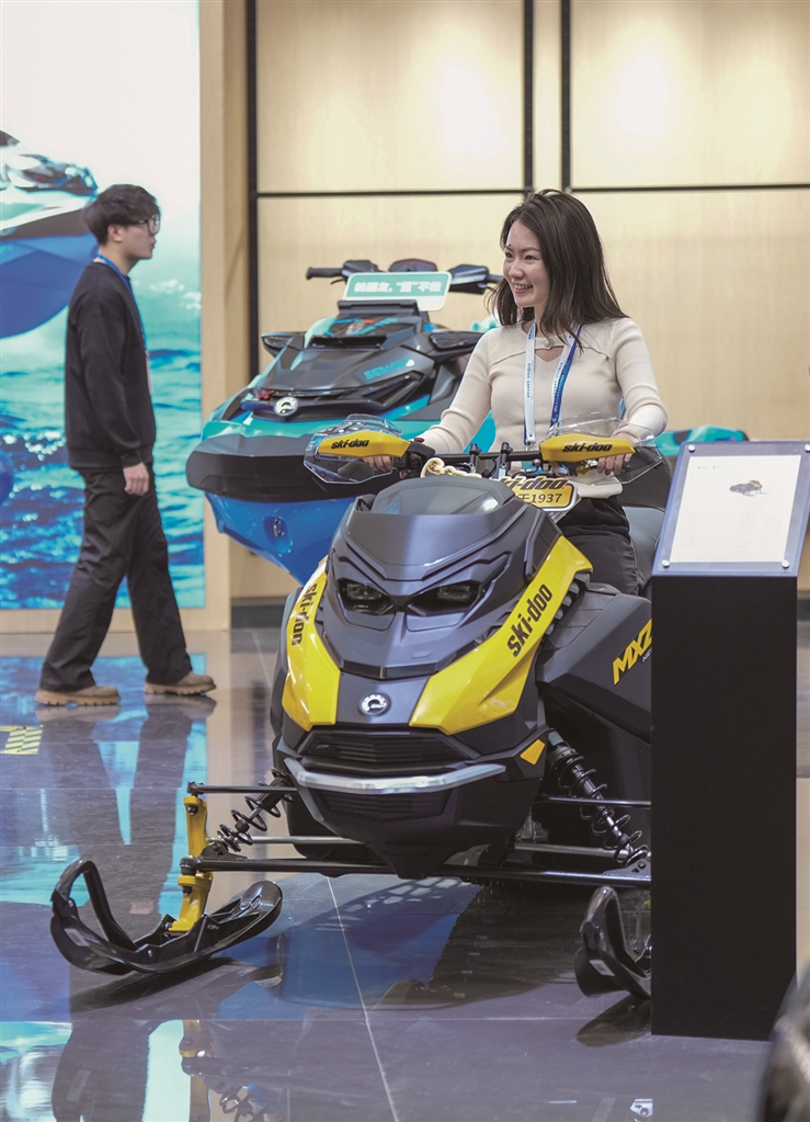 右图:1月6日,在2026哈尔滨国际冰雪经济博览会展会现场,参会嘉宾体验乘坐雪地摩托。