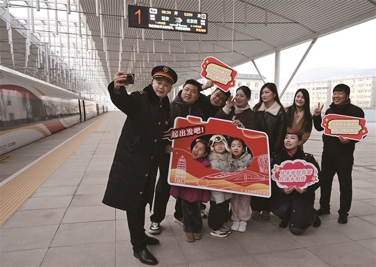 1月26日,铁路工作人员和乘坐G359次列车的乘客在延安站站台合影留念。1月26日8时39分,随着G359次列车从延安站驶出,标志着延安与北京首次实现高铁直连。调图后,延安至北京西间最快5小时42分可达。 □新华社记者 李一博摄