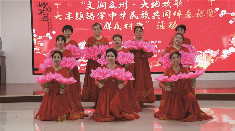 近日,在呼图壁县大丰镇群众村晚活动现场,村民表演集体舞《幸福花开》。□徐笑语摄