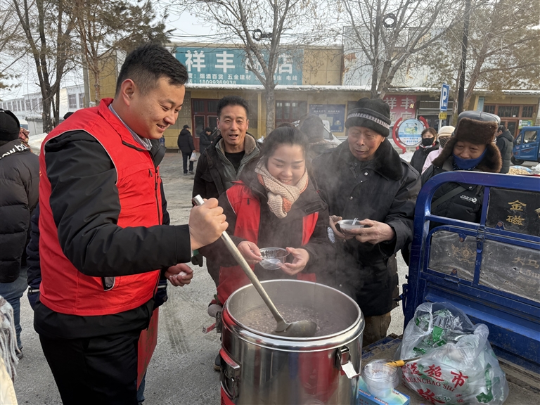 近日,吉木萨尔县北庭镇新时代文明实践所的志愿者们走进辖区早集,为集市商户送上暖心粥和喜庆春联,为集市增添了浓浓的年味儿。