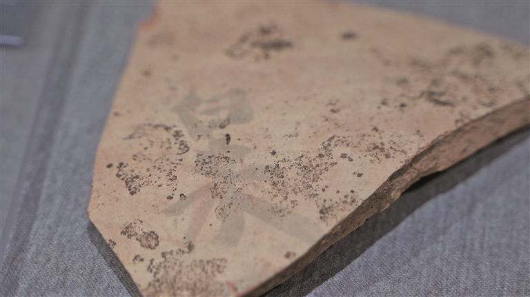 奇台县博物馆内展出的唐朝墩古城遗址中出土的墨书“白米”陶片。