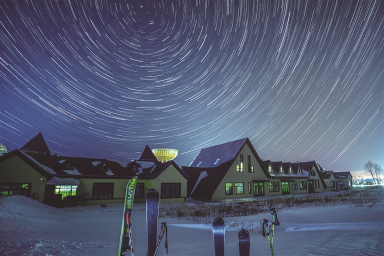 1月18日在黑龙江亚布力滑雪旅游度假区拍摄的星空下的游客服务中心(堆栈合成照片)。□新华社发(曾东摄)
