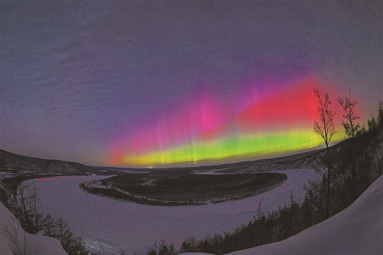 1月20日在黑龙江省漠河市图强林业局龙江第一湾景区拍摄的极光。