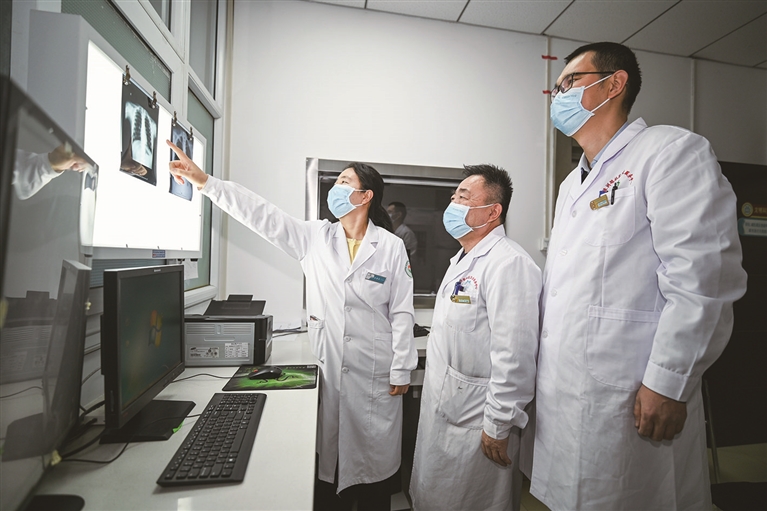 1月27日,昌吉市人民医院总医院心血管内科医师石宝兰(左一)与绿洲路街道分院医生一起研判胸片。