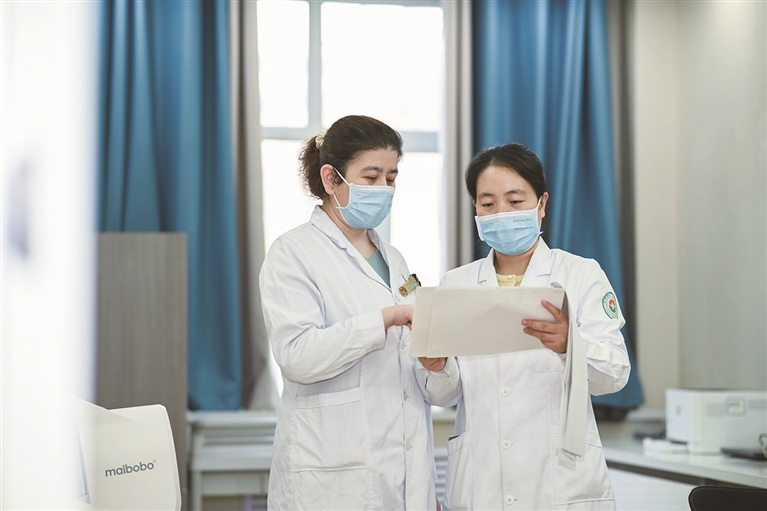 1月27日,昌吉市人民医院总医院心血管内科医师石宝兰(右)与绿洲路街道分院医生一起看心电图。