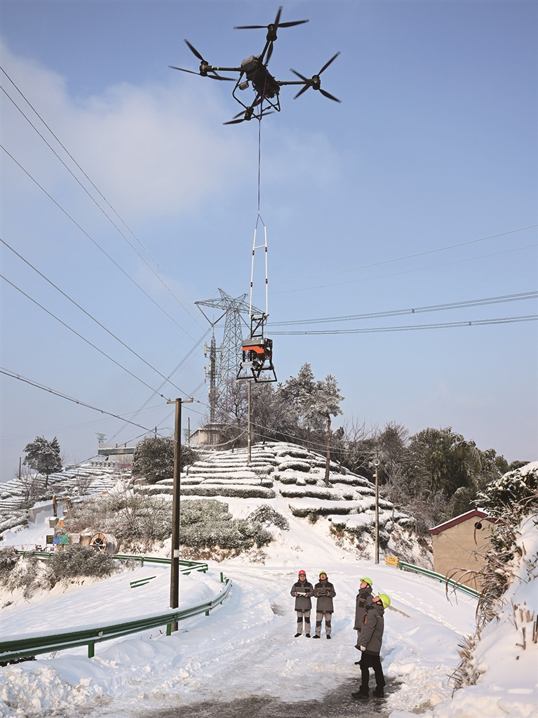 1月21日,顾庆谱(左二)操作载重无人机,准备将除冰机器人吊运至线路上。