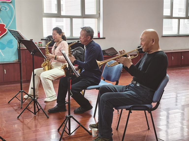 近日,在昌吉市庭州社区文化活动室,老人们在练习铜管乐器。