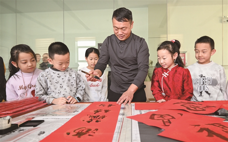 1月25日,书法老师教小朋友书写春联和“福”字。当日,呼图壁县图书馆内,家长和小朋友们学习制作祈福挂饰,阅读春节绘本,大家沉浸式体验传统年俗,在浓浓墨香中喜迎新春。