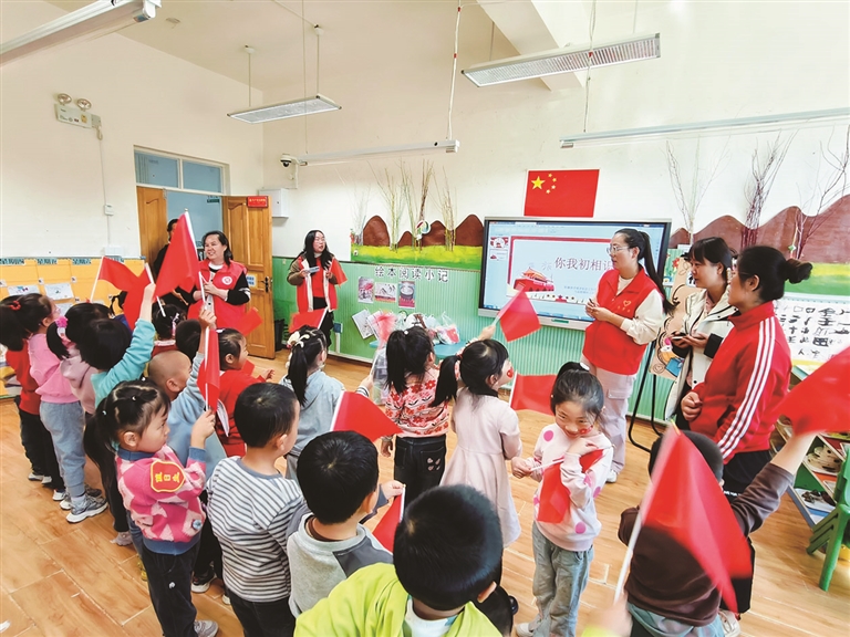 阜康市九运街镇联合阜康市手牵手社会工作服务中心在九运街镇幼儿园开展未成年人保护行动。