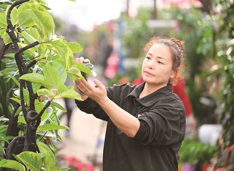 2月1日,位于昌吉市建国西路的七彩苑花卉市场,经销商在打理花卉。
