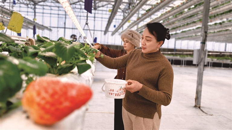 这里的草莓不走“寻常路”——不在地面扎根,反倒“住”进了离地3米的高架栽培槽。主播穿梭直播,游客提篮采摘。他们的欢声笑语为年货市场增添了喜庆、注入活力。