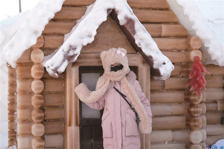 1月28日,参观者在哈尔滨冰雪大世界园区中的植物彩色冰雕房屋前拍照。