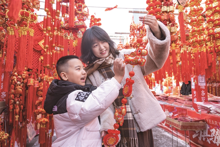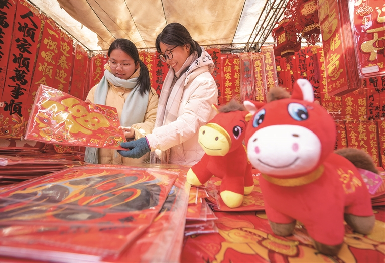 在昌吉市亚中商城年货市场,春联、“福”字、马年饰品等寓意美好、喜庆吉祥的新年饰品摆满各家摊铺,吸引众多市民前来挑选,现场一派热闹红火的新年景象。