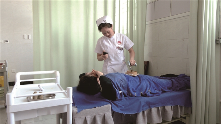 近日,玛纳斯县总医院中医医院院区的护士在为居民进行艾灸。