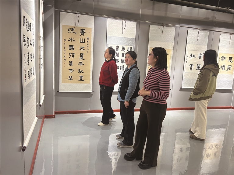 昌吉市美术馆里,前来观展的市民驻足欣赏书法作品。□张圆圆摄