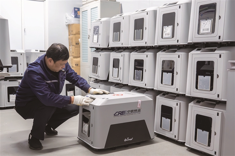 2月1日,在兰州西站站台上,中铁快运兰州西站营业部工作人员孙谦(左)和同事将旅客托运的宠物送上高铁列车。