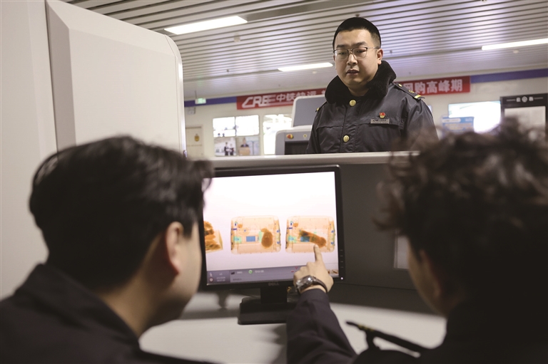 2月1日,在中铁快运兰州西站营业部,旅客托运的宠物在进行安检。