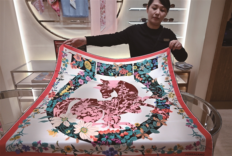 这是在海口国际免税城拍摄的马年主题丝巾(1月24日摄)。